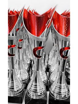 Puchar sportowy klasy PRESTIGE posiada zdobiony metalowy kielich osadzony na plastikowej zdobionej złączce, całość umieszczona jest na podstawie z naturalnego marmuru lub postumencie GBX.  Wybrane wzory pucharów mogą zawierać dodatkowo miejsce na emblemat o średnicy 25 mm. Istnieje możliwość...