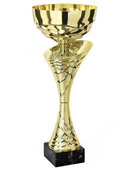 Puchar posiada standardowy zdobiony kielich metalowy osadzony na plastikowej zdobionej złączce. Całość umieszczona jest na naturalnej podstawie marmurowej.