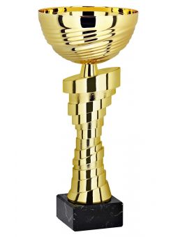 Puchar posiada standardowy zdobiony kielich metalowy osadzony na plastikowej zdobionej złączce. Całość umieszczona jest na naturalnej podstawie marmurowej.
