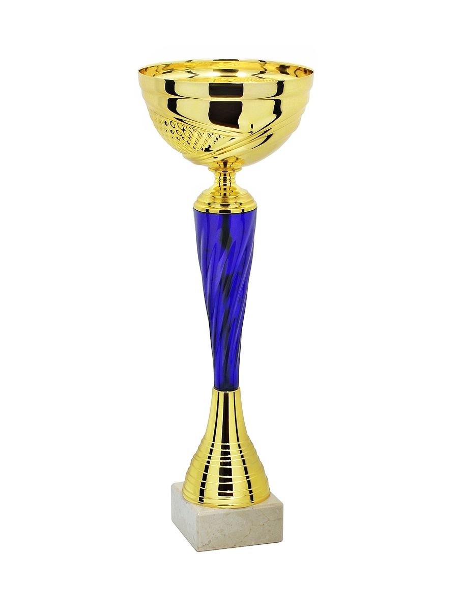 Puchar sportowy klasy STANDARD posiada zdobiony metalowy kielich osadzony na plastikowej złączce, całość umieszczona jest na podstawie z naturalnego marmuru.