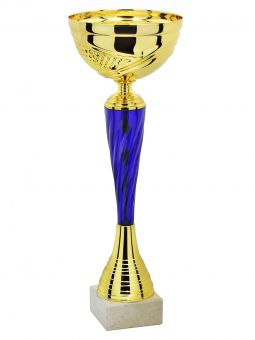 Puchar posiada standardowy zdobiony kielich metalowy osadzony na plastikowej zdobionej złączce. Całość umieszczona jest na naturalnej podstawie marmurowej.