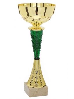 Puchar posiada standardowy zdobiony kielich metalowy osadzony na plastikowej zdobionej złączce. Całość umieszczona jest na naturalnej podstawie marmurowej.