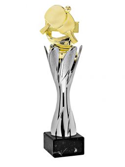 Statuetka posiada na szczycie figurkę sportową umieszczoną na plastikowej zdobionej złączce a całość umieszczona na naturalnej podstawie marmurowej.