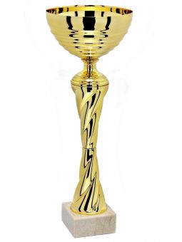 Puchar sportowy klasy SUPER ECONOMIC wykonany z komponentów plastikowych umieszczony na naturalnej podstawie marmurowej.