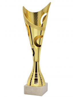 Puchar sportowy klasy ECONOMIC posiada zdobiony metalowy kielich osadzony na plastikowej złączce, całość umieszczona jest na podstawie z naturalnego marmuru.