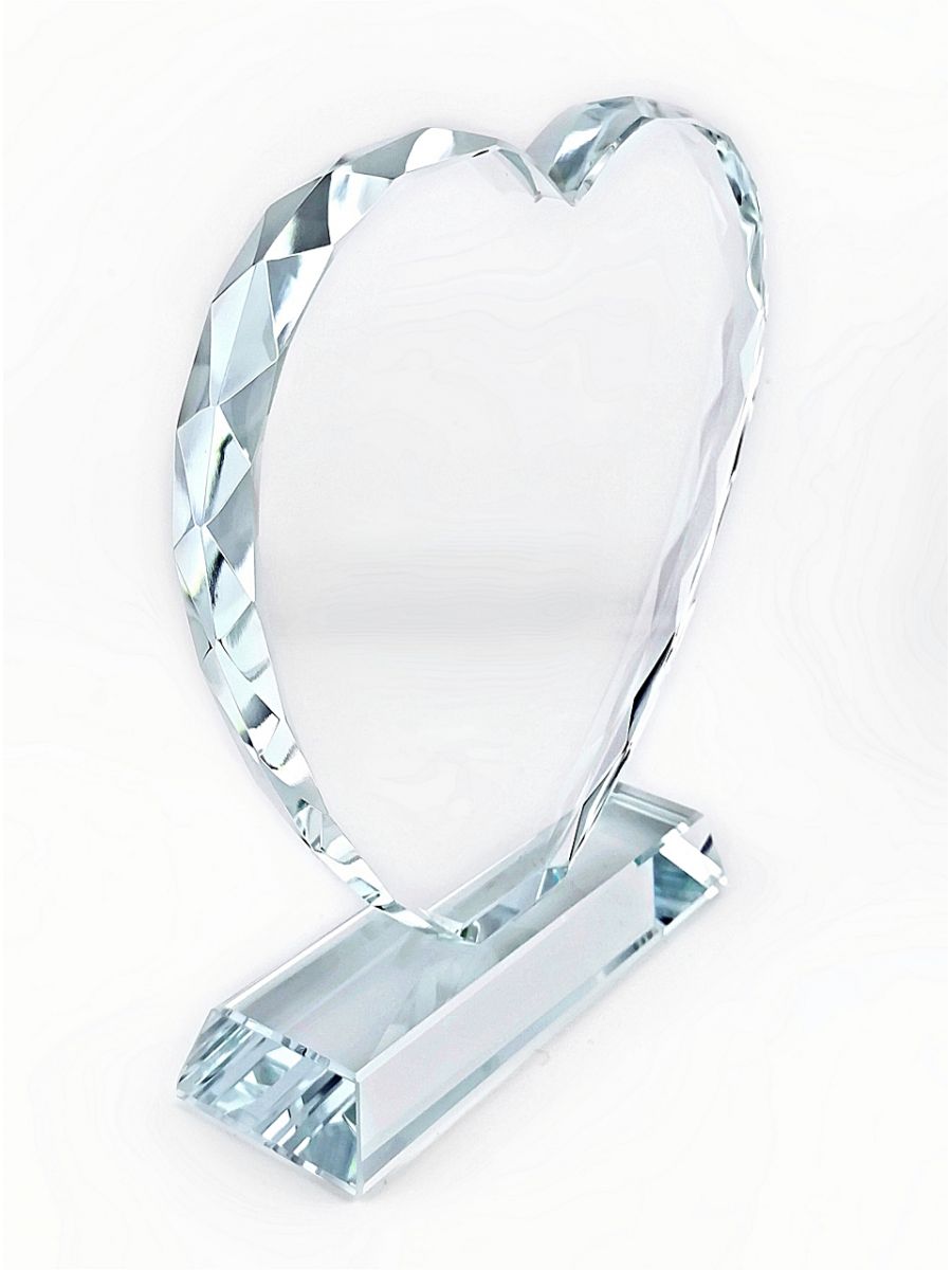 To eleganckie trofeum w kształcie serca, wykonane z wysokiej jakości przezroczystego szkła, łączy w sobie subtelność i blask. Precyzyjnie diamentowane krawędzie pięknie załamują światło, nadając statuetce luksusowego, kryształowego wyglądu.