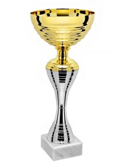 Puchar sportowy klasy STANDARD Puchar posiada zdobiony metalowy kielich osadzony na plastikowej zdobionej złączce, całość umieszczona jest na podstawie z naturalnego marmuru. Wybrane wzory pucharów mogą zawierać dodatkowo miejsce na emblemat o średnicy 25mm lub 50mm. Istnieje możliwość...
