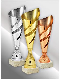 Puchar sportowy klasy MINICUPS Puchar plastikowy umieszczony na podstawie z naturalnego marmuru.  Wybrane wzory pucharów mogą zawierać dodatkowo miejsce na emblemat o średnicy 25 mm. Nagrodę można zamówić wraz z tabliczką grawerowaną umieszczoną na postumencie marmurowym.