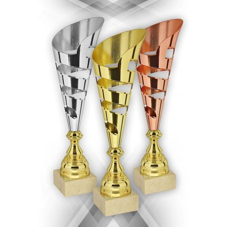 X175-KOMPLET 3szt Puchary FOX seria G/S/B - kolor złoty/srebro/brąz, wymiary H-365 mm W-90 mm (tab. 70x25 mm / MX422)