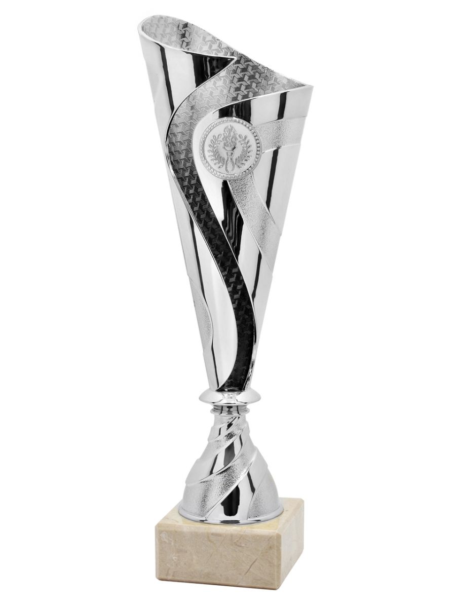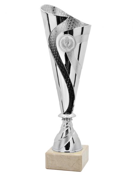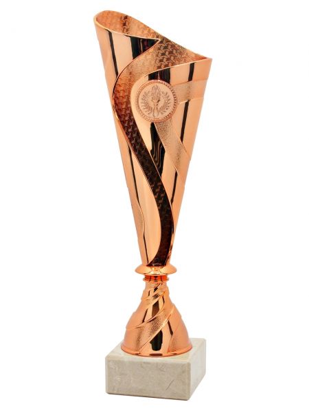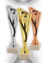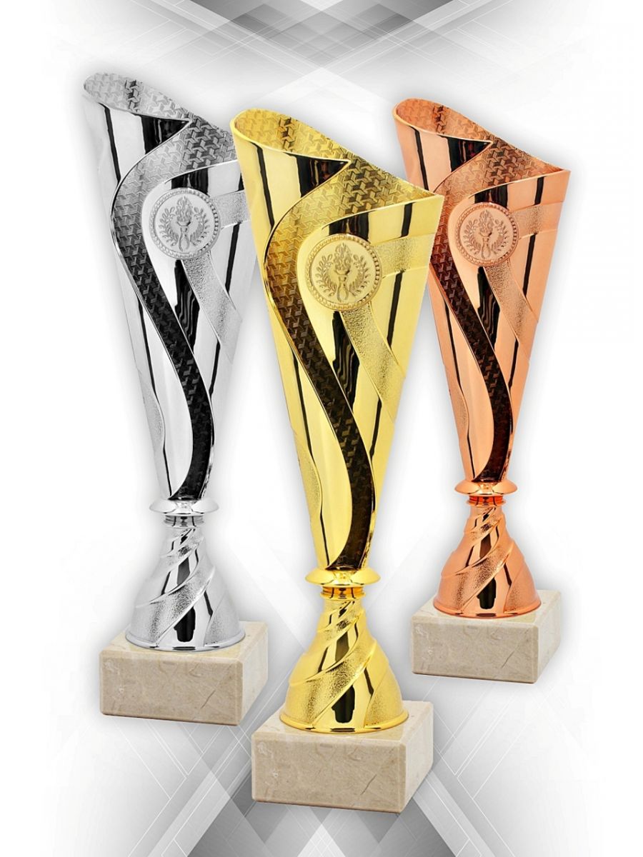 Puchary plastikowe DANCE w kolorze złotym / srebrnym / brązowym, o wysokości (H) 285mm i szerokości (W) 95mm posiadają miejsce na wklejkę o średnicy 25mm i mogą być wyposażone w tabliczkę o wymiarach 60x25 mm (MX421),