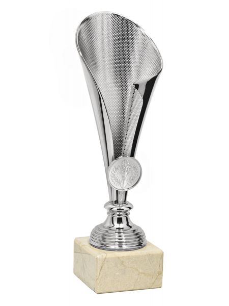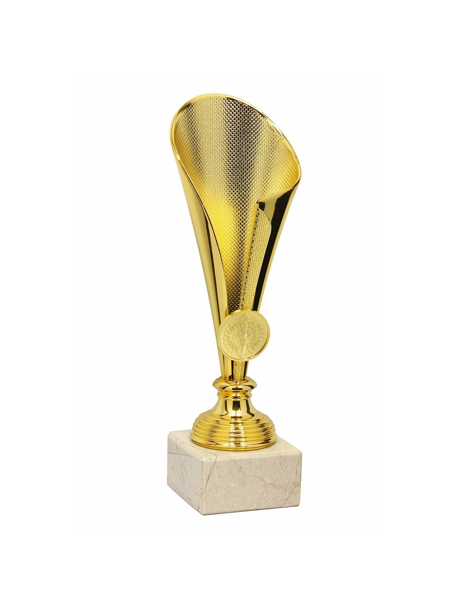 Puchar sportowy klasy SUPER ECONOMIC wykonany z komponentów plastikowych umieszczony na podstawie z naturalnego marmuru lub syntetycznej podstawie GBX w zależności od modelu pucharu.