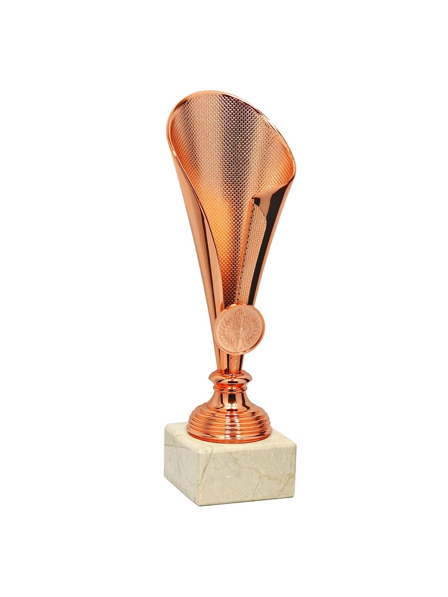 Puchar sportowy klasy SUPER ECONOMIC wykonany z komponentów plastikowych umieszczony na podstawie z naturalnego marmuru lub syntetycznej podstawie GBX w zależności od modelu pucharu.