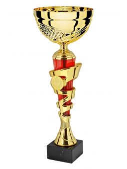 Puchar sportowy klasy STANDARD posiada zdobiony metalowy kielich osadzony na plastikowej złączce, całość umieszczona jest na podstawie z naturalnego marmuru.