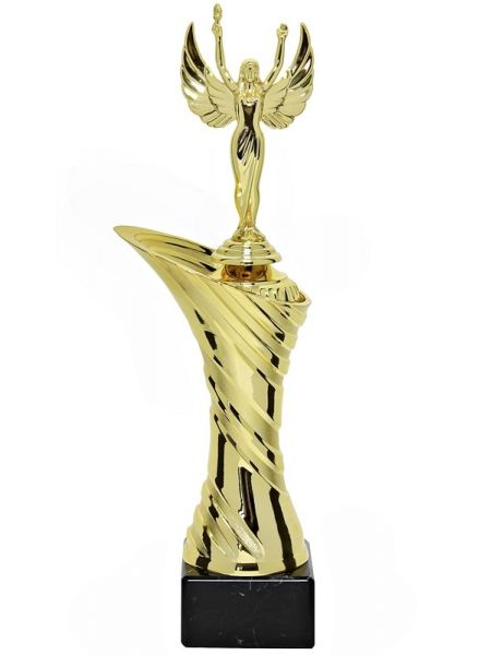 Puchar sportowy klasy SUPER ECONOMIC wykonany z komponentów plastikowych umieszczony na podstawie z naturalnego marmuru lub syntetycznej podstawie GBX w zależności od modelu pucharu.
