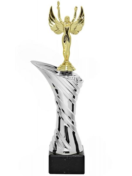 Puchar sportowy klasy SUPER ECONOMIC wykonany z komponentów plastikowych umieszczony na podstawie z naturalnego marmuru lub syntetycznej podstawie GBX w zależności od modelu pucharu.