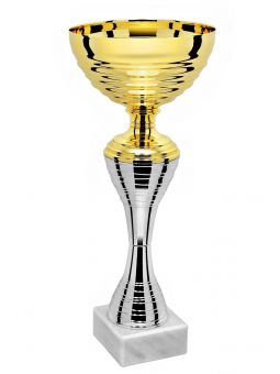 Puchar sportowy klasy STANDARD posiada zdobiony metalowy kielich osadzony na plastikowej złączce, całość umieszczona jest na podstawie z naturalnego marmuru.