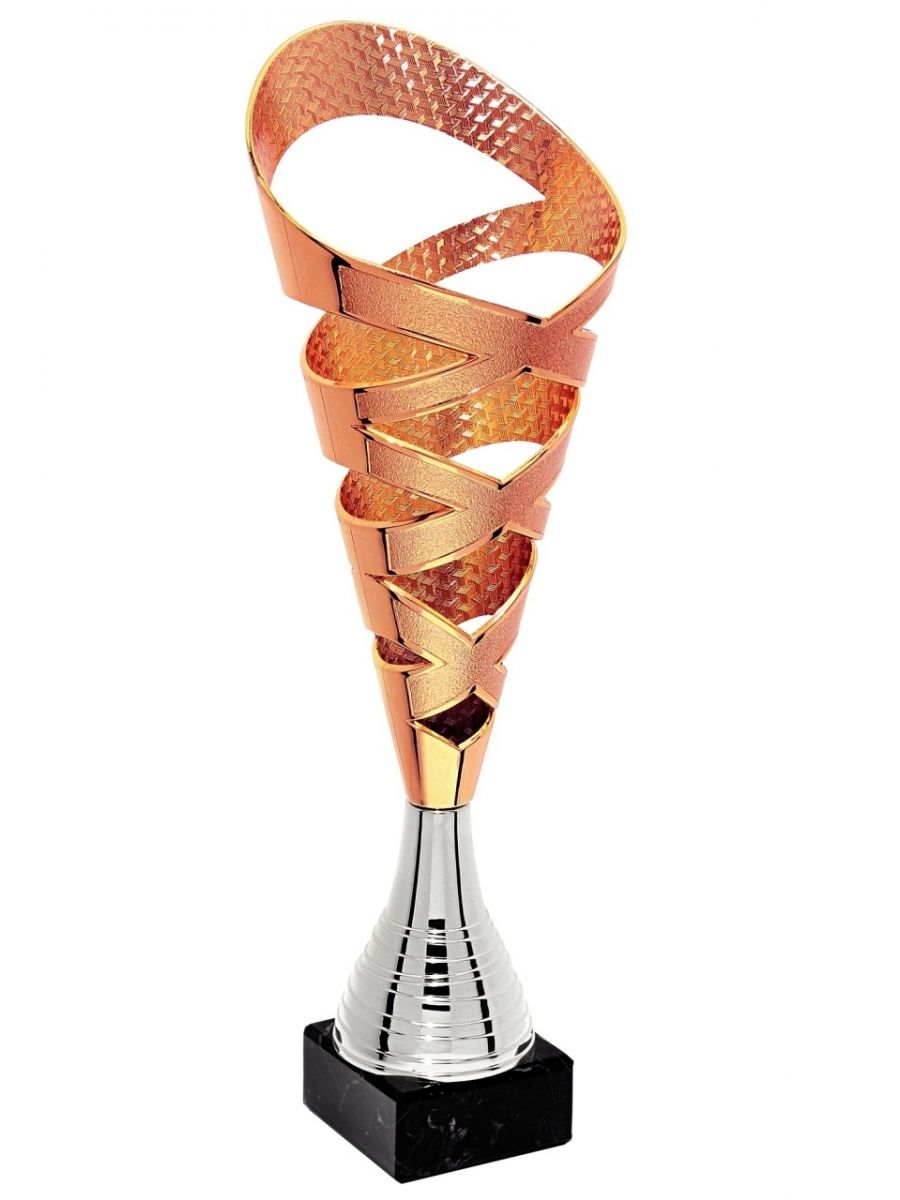 Puchar sportowy klasy ECONOMIC posiada zdobiony metalowy kielich osadzony na plastikowej złączce, całość umieszczona jest na podstawie z naturalnego marmuru.